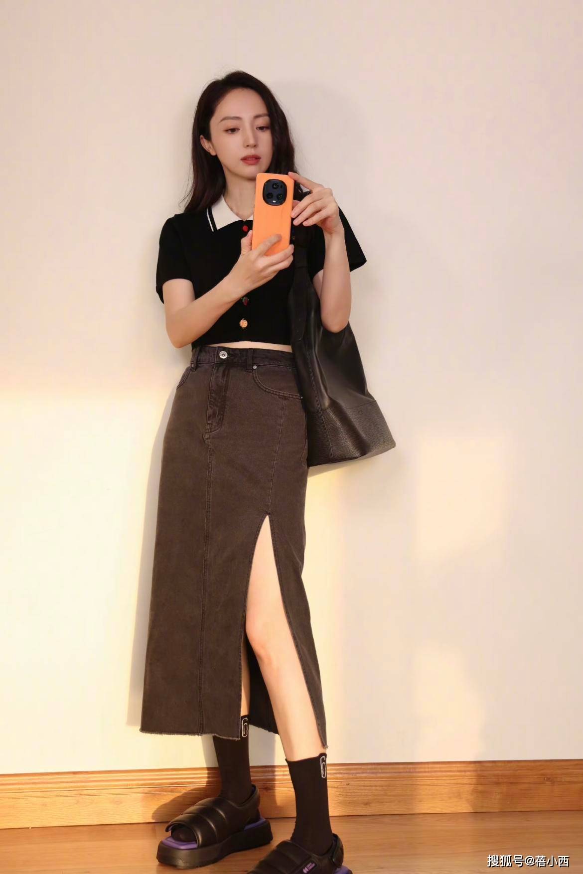 夏季搭配中,除了t恤还有polo衫值得入手,董璇穿上黑色polo衫,看起来文艺范儿十足,非常减龄,短上衣和高腰的半身裙衔接起来,拉伸了比例,拉高的腰身,增高还显瘦。下半身的半身裙侧面开叉,可以修饰双腿,增加露肤度,确实挺显腿长。