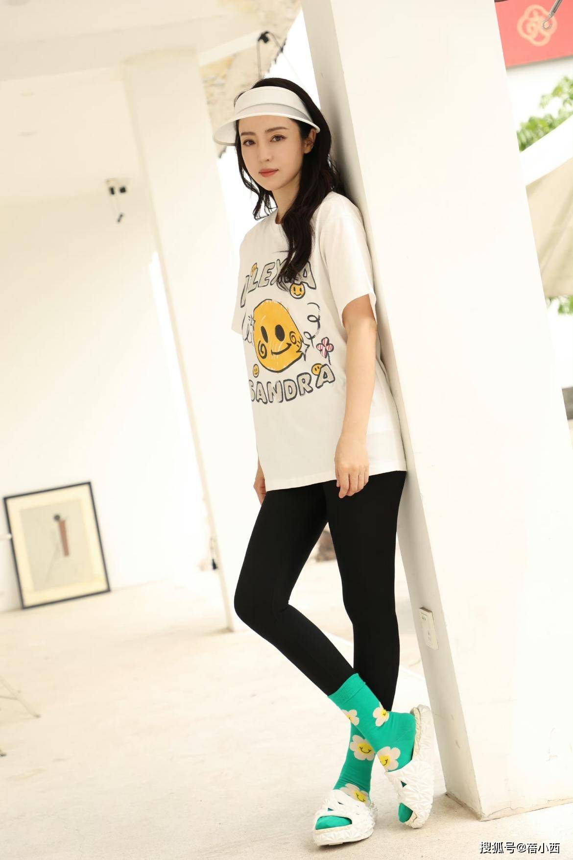 宽松的t恤基本上没有搭配难度,任何人都可以穿,尤其是董璇搭配的oversize t恤,宽大的版型可以遮肉显瘦,拜拜肉和小肚腩都可以被藏起来,再加上紧身鲨鱼裤搭配在下半身,修饰了双腿,松紧结合更显瘦。而这一身搭配的亮点在于鞋子,搭配拖鞋配绿色短袜,层次感很强,休闲感十足。