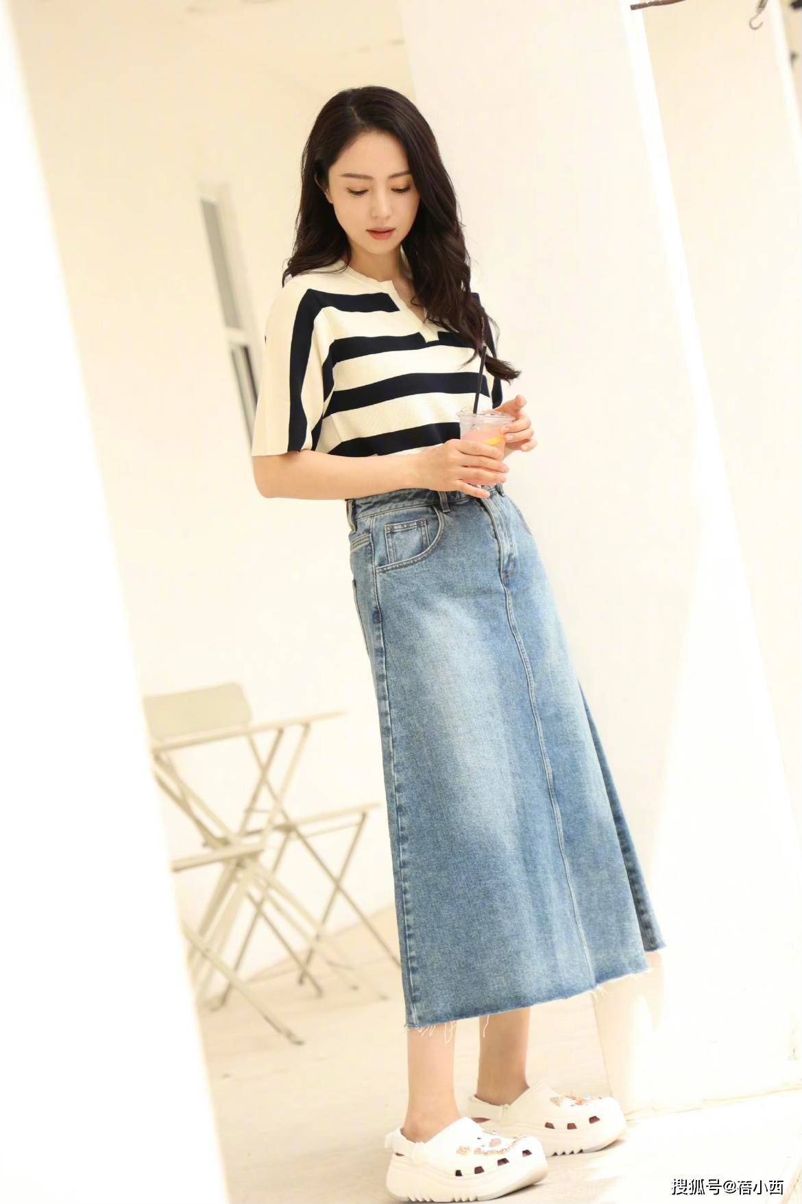 条纹衫也挺经典的,如果你在夏季穿腻了白t恤,不妨入手一件条纹衫,而且董璇这一身条纹衫结合黑白色,经典配色更耐看,下半身搭配浅蓝色的牛仔半身裙,增加轻盈感,看起来很清爽减龄,踩上洞洞鞋,也可以体现随性感,潮爆了!