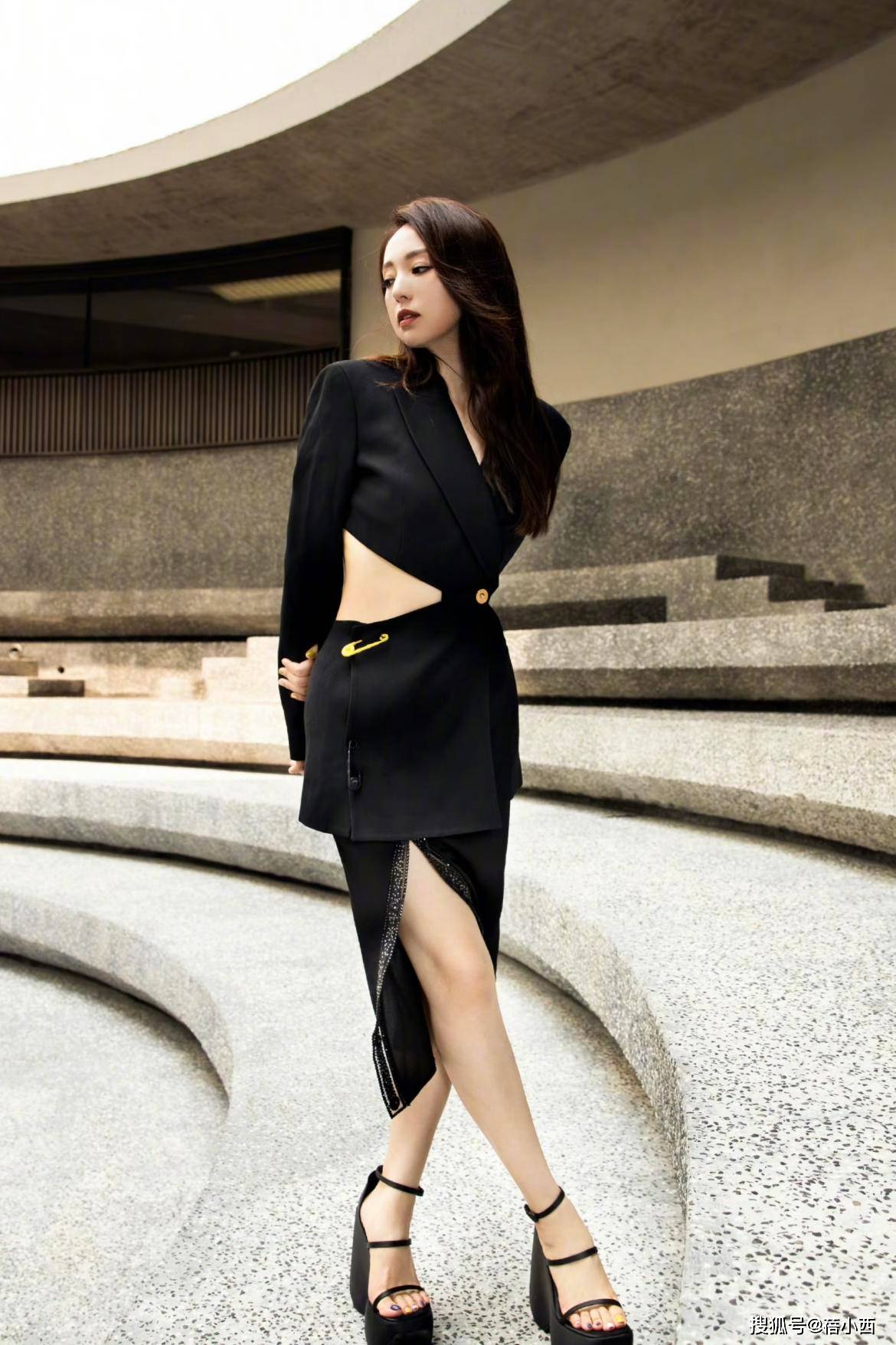 西装真不只是职场打工人才能穿的衣服,比如董璇这一身露腰短西装就很适合凹造型,短款设计自带时髦感,修饰了小蛮腰,再结合开叉半身裙,更是极大程度修饰了腿长,显得比例很好。