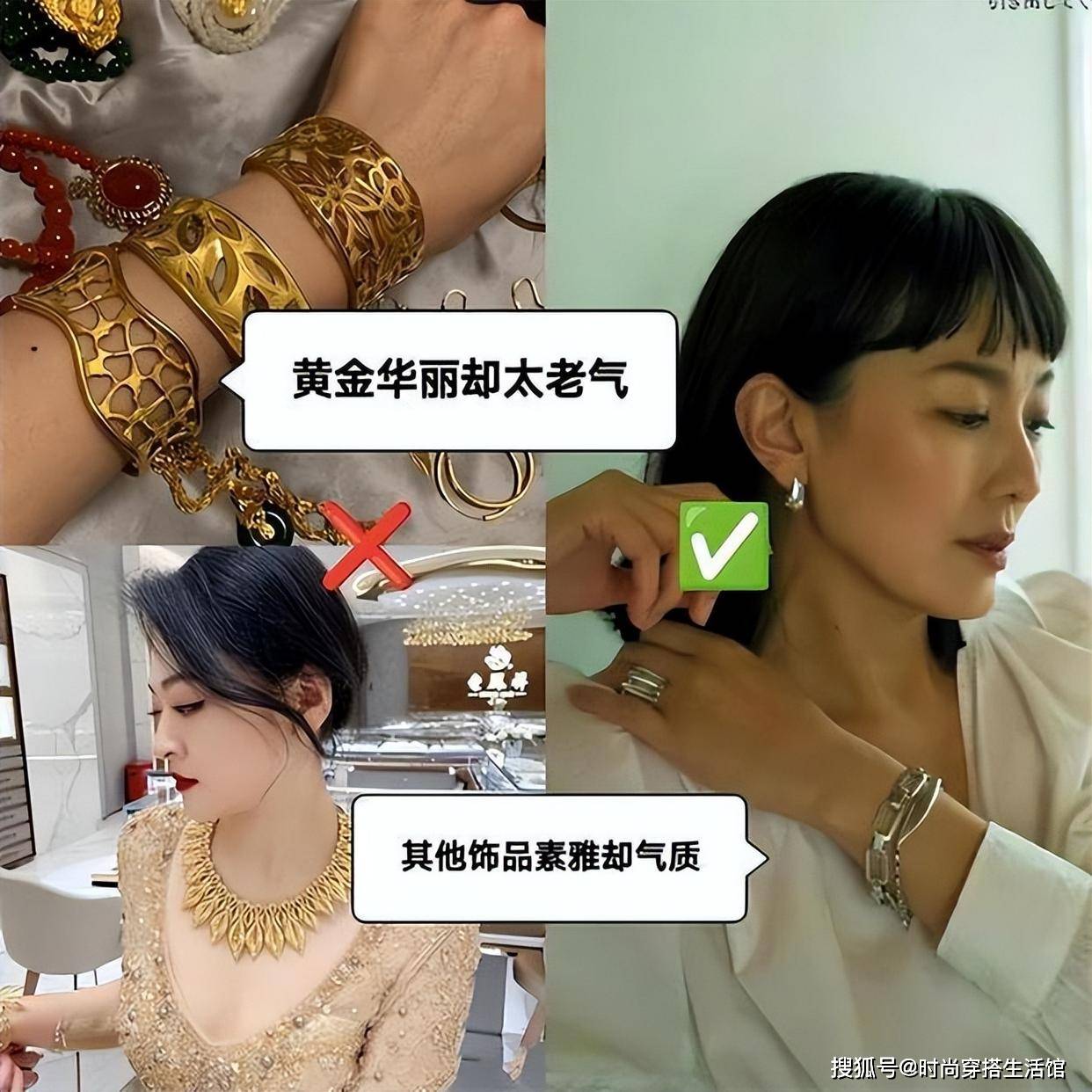 最后就是有些中年女性会巴不得将财物全部暴露出来,从而选择佩戴各种大体积感的金首饰,比如像是金项链、金手镯、金戒指和金耳环等等,自以为选择佩戴金舒适非常的气派上档次,殊不知大面积的“炫富”反而会给你带来一种“暴发户”的既视感,视觉上看起来会显老10岁不止。