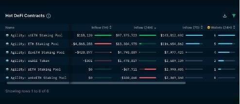根据 Nansen 的数据显示,Agility 在过去一周流入了总价值超过 2.76 亿美元的资产,其中 ETH 与 stETH 占最大宗,两者在过去 24 小时总计流入超过 1.1 亿美金。