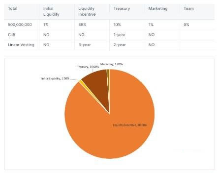 AGI 代币总量为 500,000,000 颗,采用 Fair Launch 的形式发行,团队没有分配任何代币份额,仅能通过参与流动性挖矿的方式获得代币。不过,代币总供应量的 1% 被分配为市场推广预算,团队表示这些代币将仅作为做市资金。