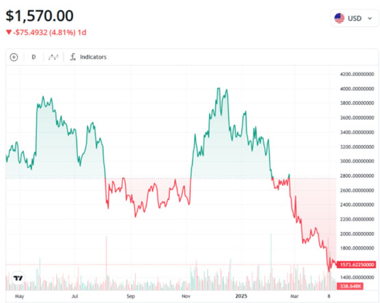 数据显示,ETH 价格在为期四个月的下跌趋势中下跌超过 61%,这一趋势始于 2024 年 12 月 16 日 ETH 短暂突破 4100 美元时。这就像一艘船遭遇了风暴,一路颠簸下行。