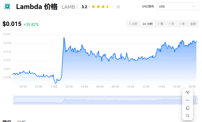 Lambda当前价格为$0.015,过去24小时内上涨了35.82%。目前,Lambda市值排名第249位,实时市值为$2,661.39万,流通供应量为18.62亿LAMB,最大供应量为60.00亿LAMB。我们会实时更新Lambda/USD的价格。