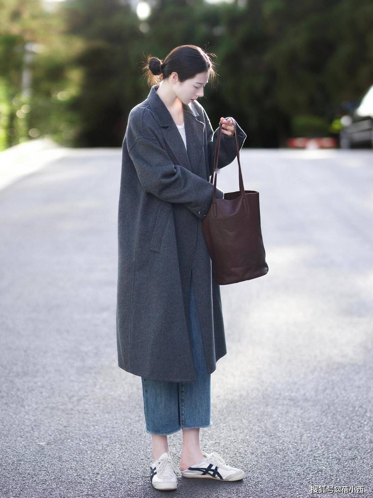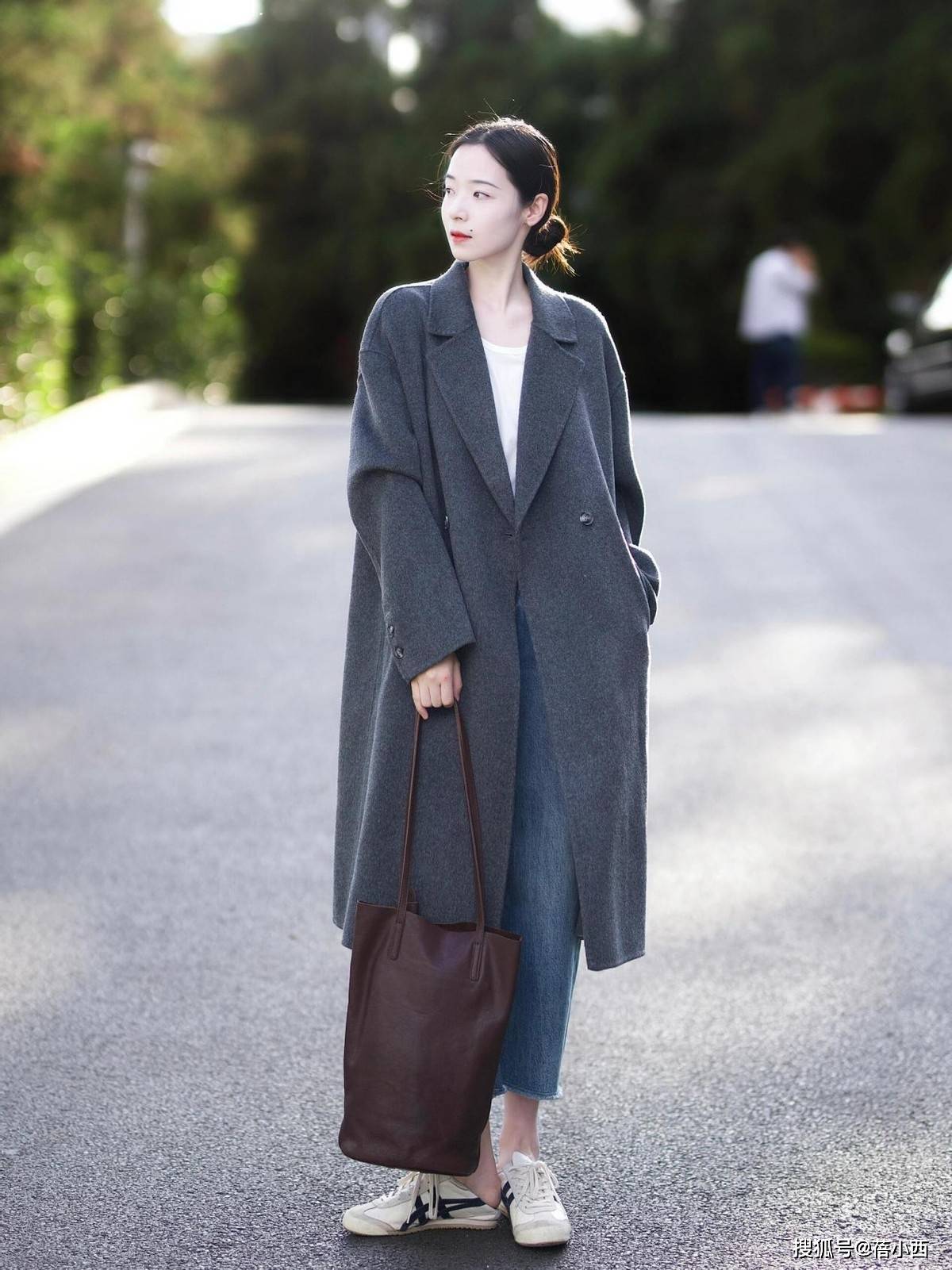 比如这种灰色大衣和牛仔阔腿裤的组合,材质上通过硬挺与柔软的碰撞中和了大衣的厚重,又弱化了牛仔裤的随意,质感瞬间升级。害怕拖沓的姐妹们可以选九分长度的阔腿裤,配平底鞋也不累赘显矮。