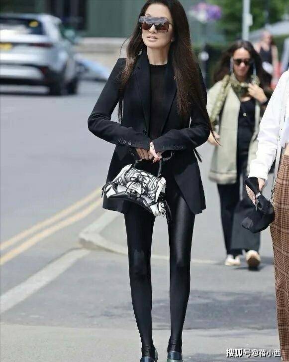 下半身搭配缎面的紧身裤,更是修饰了她的筷子腿,裤子贴在腿上却不紧绷,反而顺着腿型拉出流畅的线条,从大腿到脚踝的弧度干净利落,一般人真的穿不出这种感觉,更重要的是,裤子的缎面光泽和上衣的哑光形成对比,让全黑的穿搭有了层次,不至于沉闷压抑,反而透着低调的贵气。