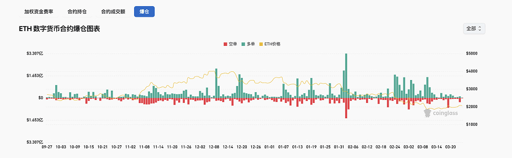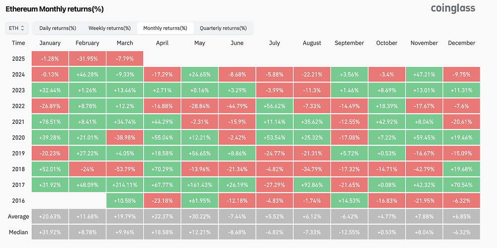Coinglass的数据显示,以太坊在2025年第一季度的表现着实惨淡: