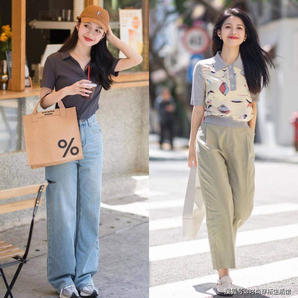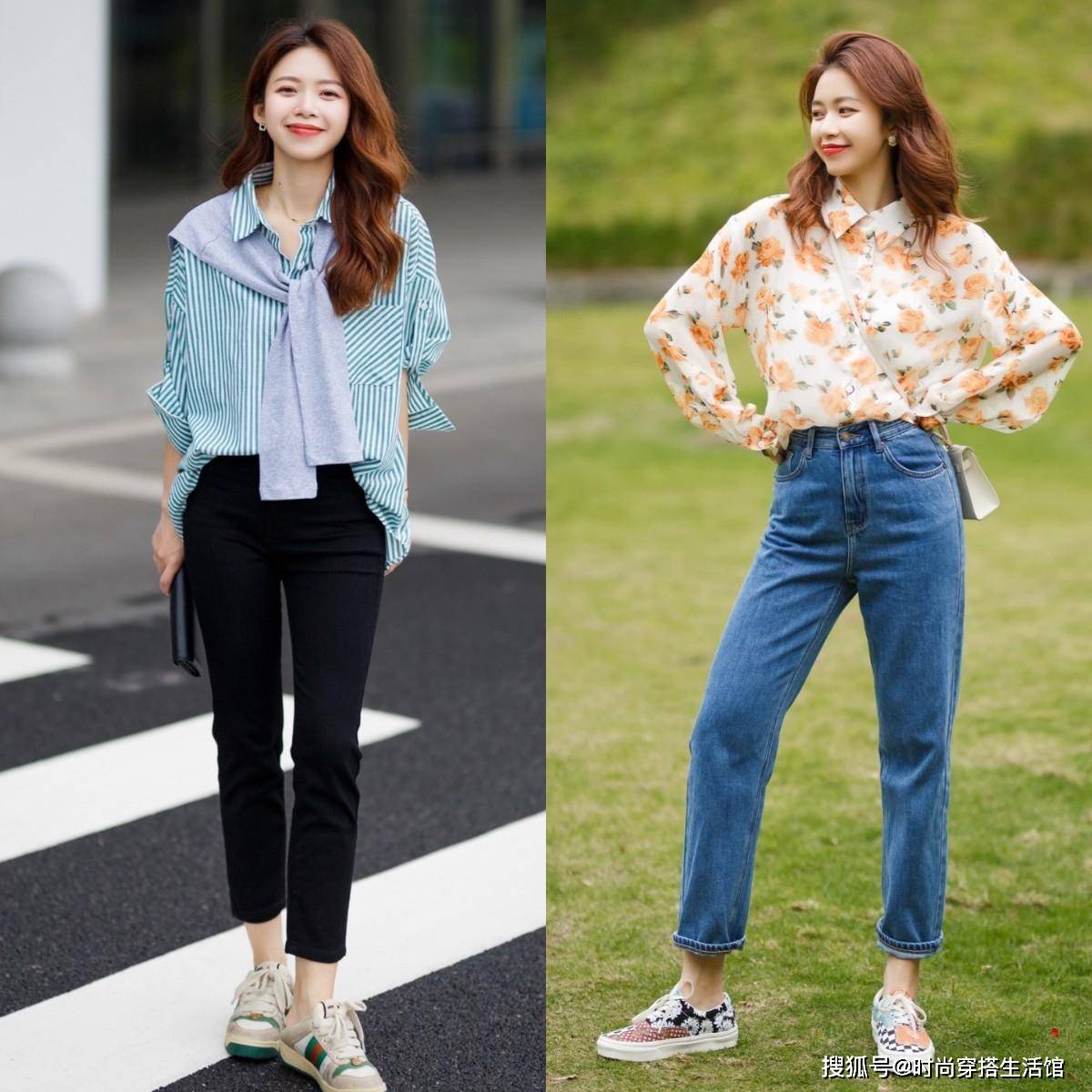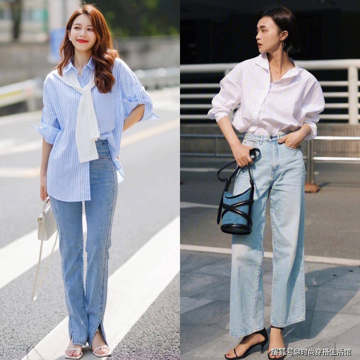 比如上图的两套搭配就利用了将衬衫下摆塞进牛仔裤里的搭配方式,这样的技巧可以有效地提高腰线,从而穿出显瘦显高的搭配效果。