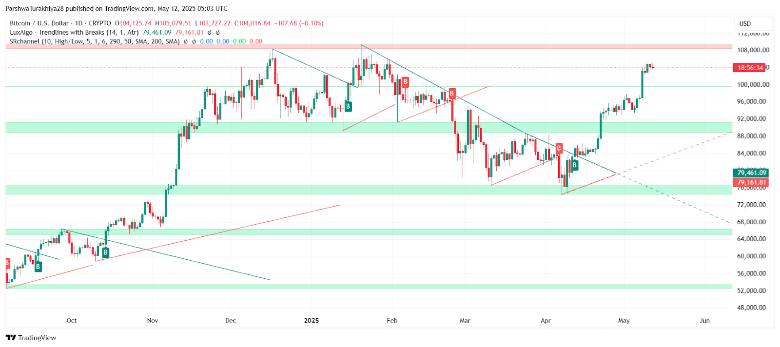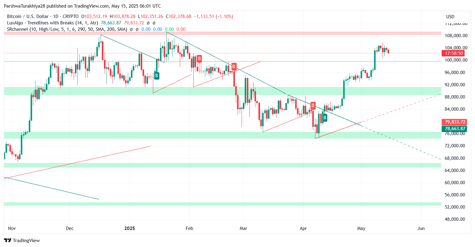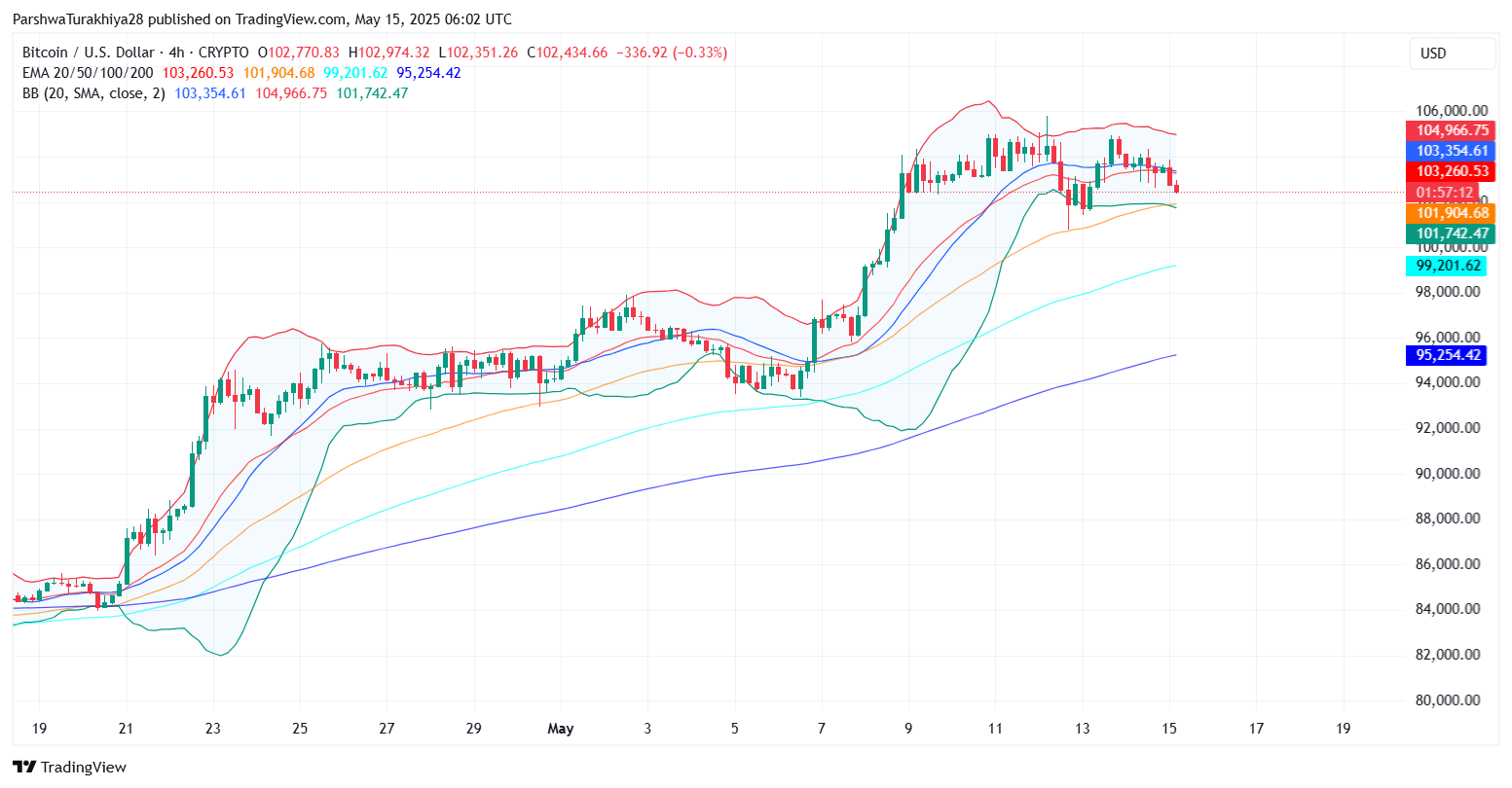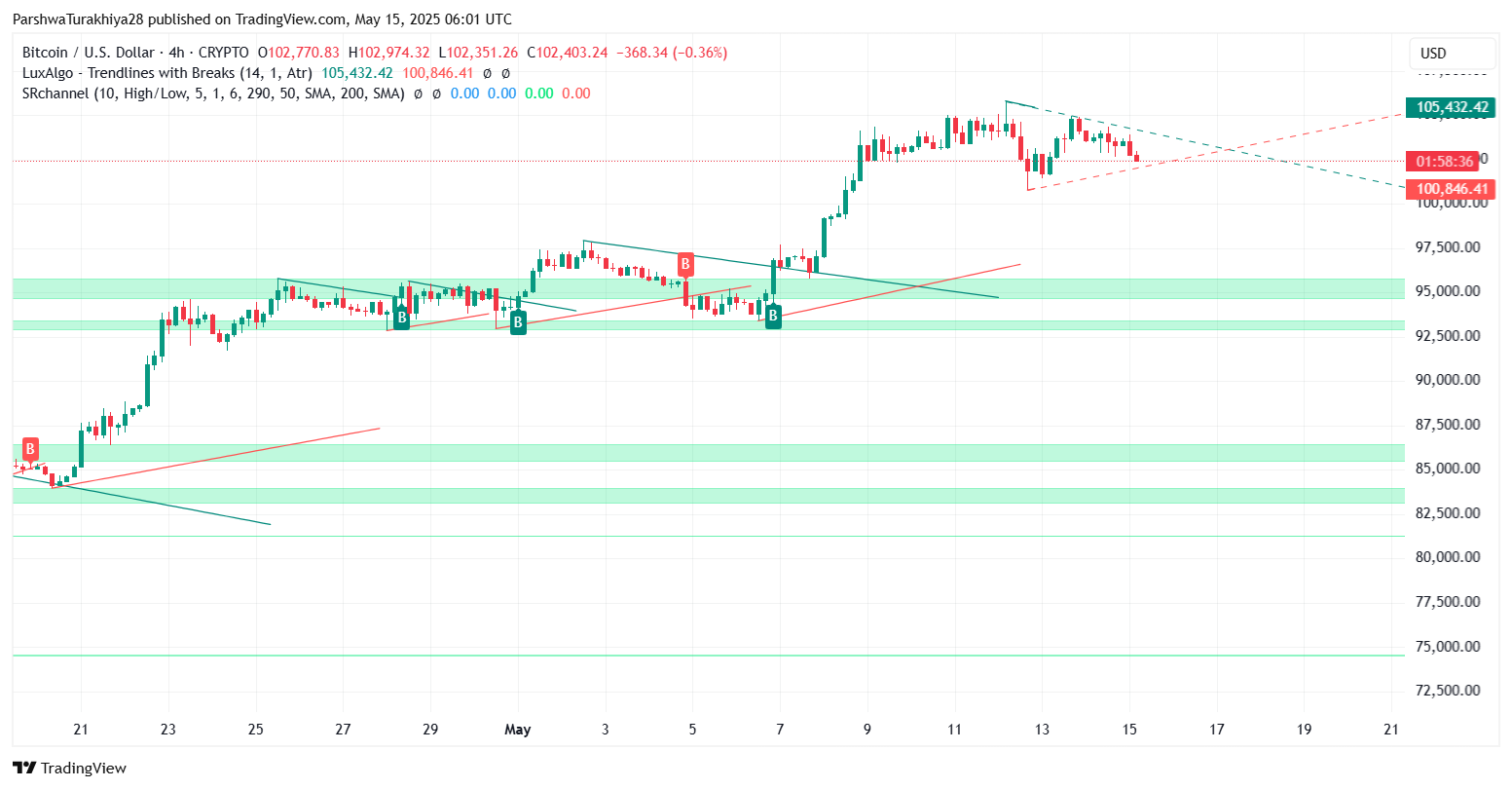 如果收盘价跌破102,000美元,那么可能会引发一波下跌至100,800美元的走势,这个位置与当前4小时三角形的下行趋势线相吻合。自5月10日以来,这个水平一直充当着动态支撑,对于维持当前的结构至关重要。