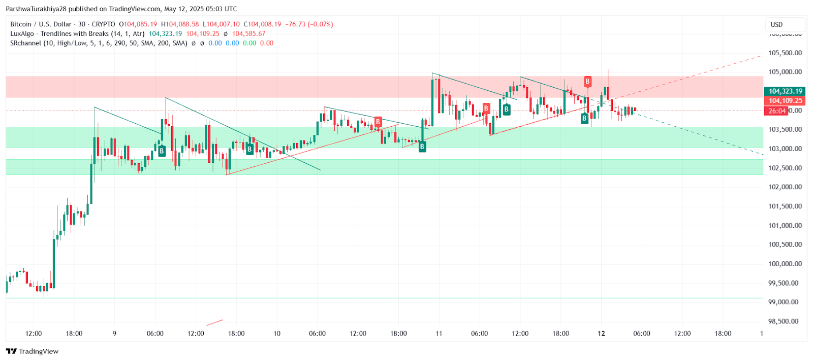价格仍处于短期盘整阶段和强劲的宏观上涨趋势之间。30分钟图显示,在103,800美元的支撑位和104,800美元的阻力位之间形成了一个窄幅区间,多头和空头均未完全掌控局面。