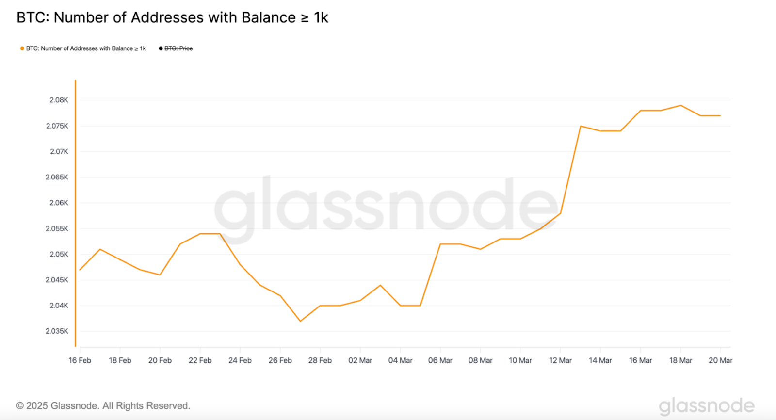 Glassnode的链上数据显示,持有超过 1,000 BTC 的巨鳄wallet数量大幅增加。这些wallet数量从 2,040 个增加到 2,079 个。目前,这些wallet数量停留在 2,077 个,这可能预示着上涨趋势。过去,巨鳄的囤积曾导致比特币大幅上涨,因此暗示短期内可能出现上涨。