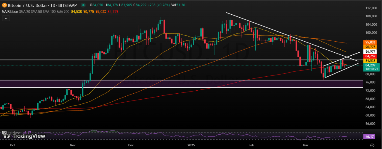 然而,如果价格没有突破阻力位,我们可能会跌至关键支撑位 80,000 美元,如果跌至 76,000 美元左右。相对强弱指数 (RSI) 为 46,表明势头中性,任何方向都有波动空间。
