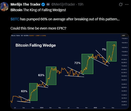 比特币价格历史充斥着证据表明,突破下降楔形模式会导致价格相对平均上涨 66% 以上。在过去六个月中,BTC 从类似的技术设置中上涨了 63% 和 72%。如果历史可以作为参考,那么目前的价格似乎略低于重要的价格突破。也许比特币会创下历史新高。