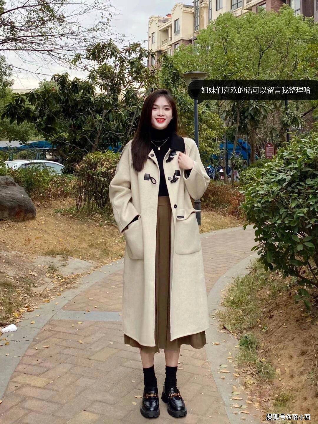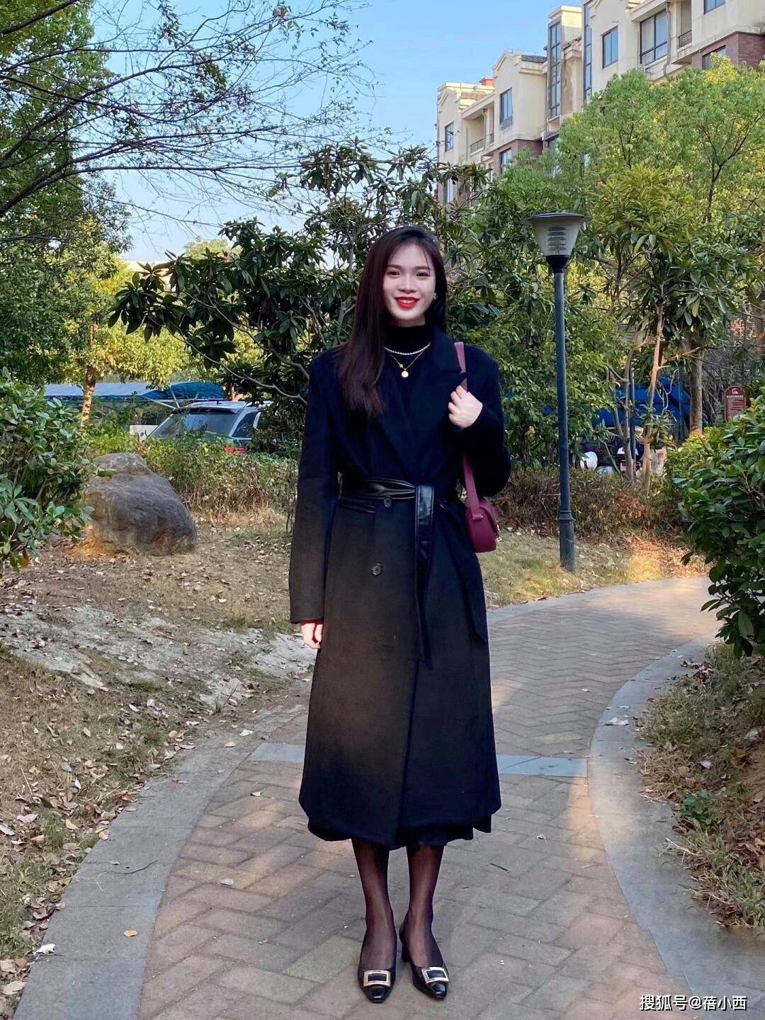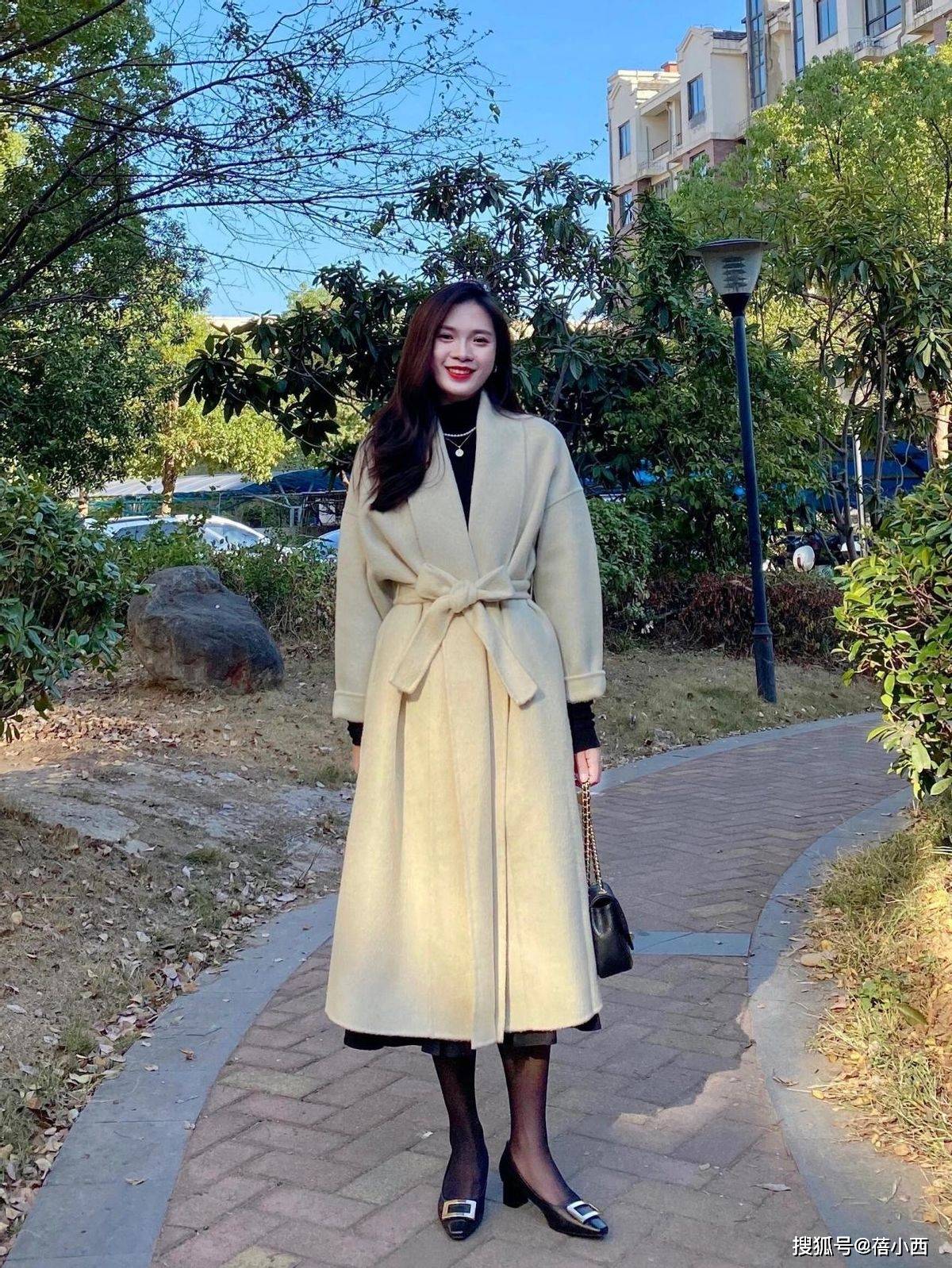 长度方面,建议大家选到膝盖以下、小腿中部的半身裙,比短裙保暖,还能修饰腿型,和长款大衣形成呼应,显得优雅又大气,像这种杏色的束腰大衣搭配黑色半身裙,再搭配一条黑色丝袜,踩上低跟鞋,女人味直接拉满。