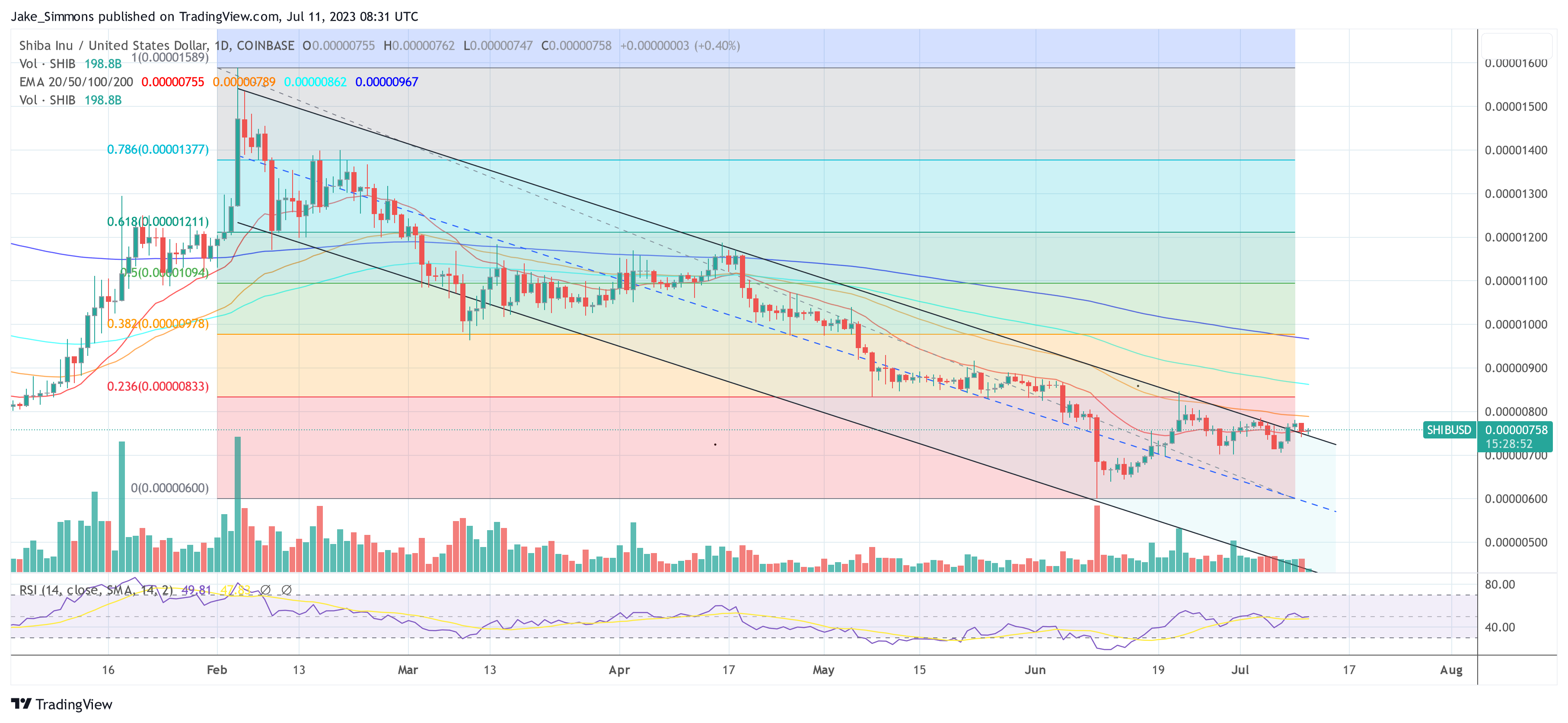 正如 NewsBTC 昨天报道的那样,如果 SHIB 的多头能够验证这一突破,价格可能会上涨 30%。这将使 SHIB 接近 0.00000969 美元(200 日均线)和 0.00000977 美元(38.2% 斐波那契)之间的阻力区域,并有望达到 0.00001 美元这一重要的心理关口。