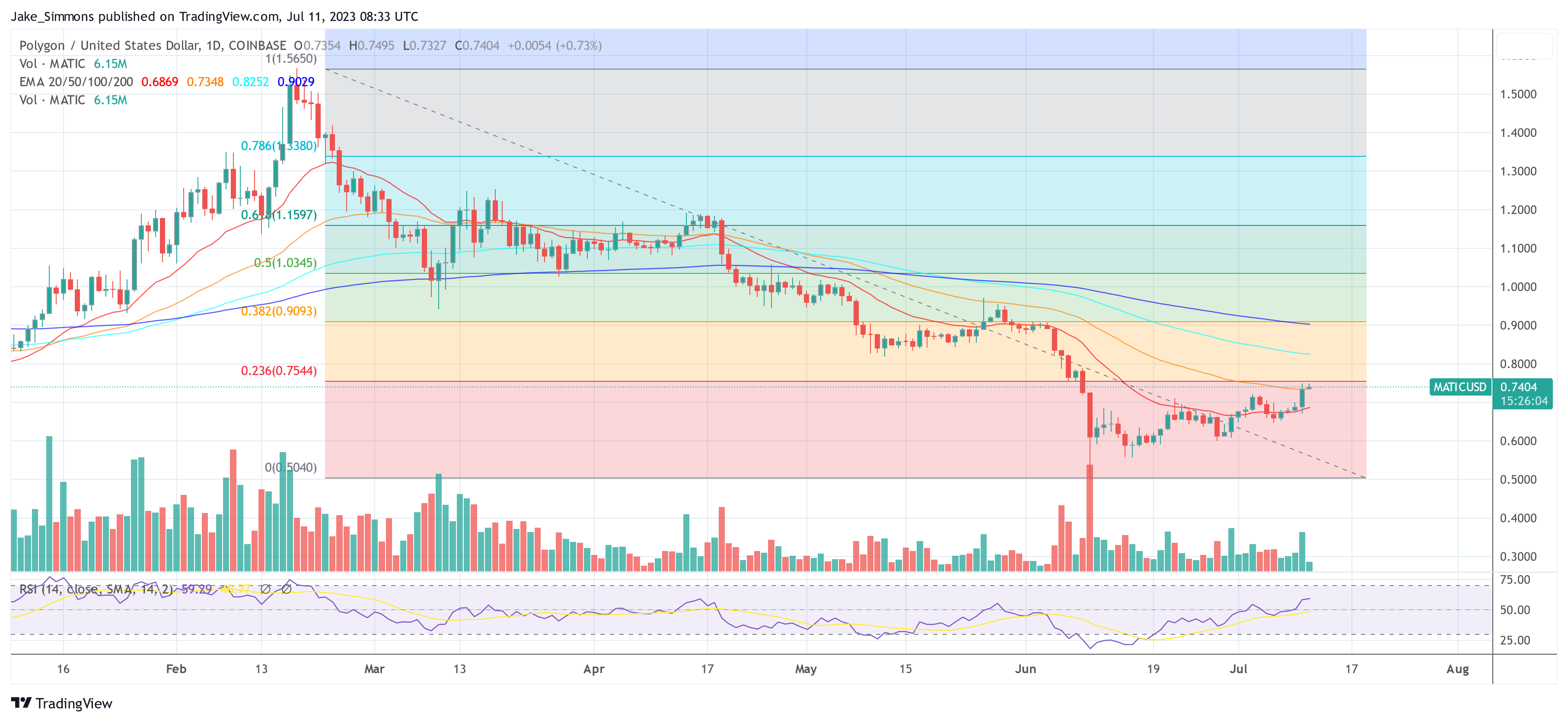 从技术角度来看,MATIC 自 6 月份触底以来已上涨 40%。目前价格低于 23.6% 斐波那契回撤位,突破这一水平可能会推动 MATIC 向 200 日均线和 38.2% 斐波那契回撤位迈进,从而带来 22% 的上涨。然而,突破第一个斐波那契水平 0.756 美元的阻力是观察潜在上涨势头的关键一步。