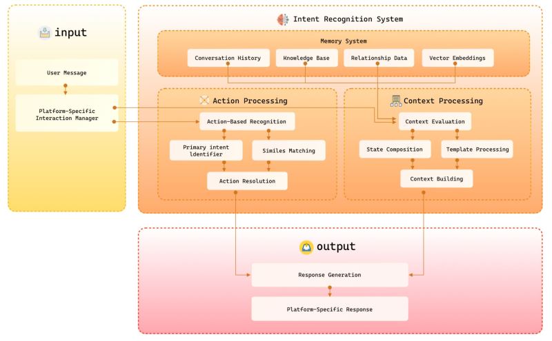 ElizaOS的设计强调灵活性和易用性,通过“代理”、“角色档案”、“供应商”、“行动”、“评估器”等模块的组合,让使用者能够快速打造一个具备强大功能的AI代理。