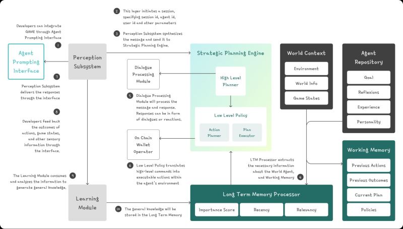G.A.M.E的核心组件包括代理提示界面、感知子系统、战略规划引擎、对话处理模块和链上wallet操作。这些组件协同工作,使AI代理能够根据其独特的个性和过去的经验做出决策,并对玩家动作和其他代理的行为做出动态反应。这种自主性和适应性带了无限多样的游戏体验,每个对话都可能以全新的、意想不到的方式展开。