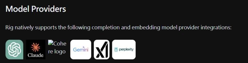 Rig原生支持多种LLM供应商,包括OpenAI、Cohere、Anthropic、Perplexity、Google Gemini、xAI、EternalAI、DeepSeek、Azure OpenAI和Mira。