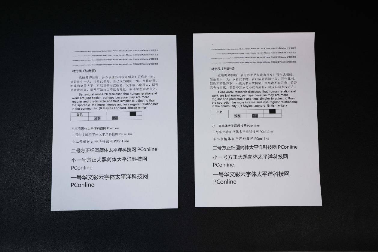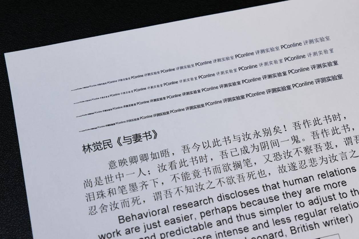 在打印质量方面,TG1000DN的表现也是相当出色的。可以看到我们打印的测试样张中,字迹平滑且清晰,即便是三号的微软雅黑也可以清晰分辨。