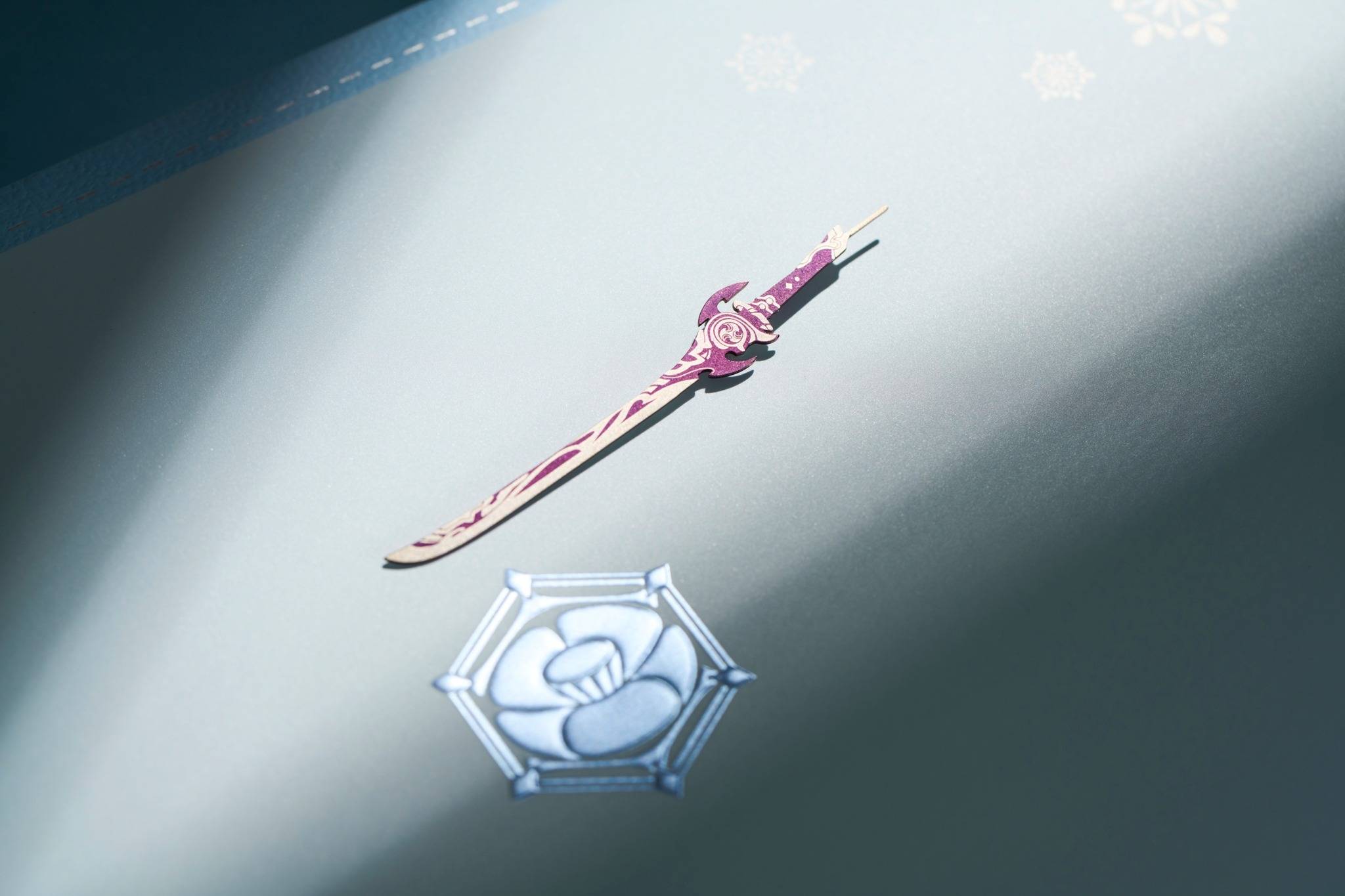 「雾切之回光」定制卡针绝对是全场最佳。这枚不锈钢材质的卡针完全复刻了神⾥绫华的专武造型,剑柄处的紫⾊宝⽯采⽤滴胶工艺,剑⾝纹路则通过激光雕刻实现。更贴⼼的是,卡针配有专属收纳卡——⼀张印有社奉⾏家纹的⾦属卡⽚,既防⽌丢失⼜能当书签使⽤。