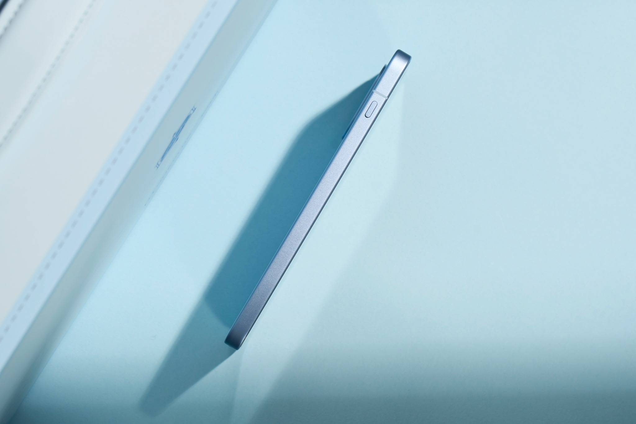 取出⼿机的瞬间,我终于理解为什么官⽅称其为「雪霁蓝」。这种低饱和度的冰蓝⾊调,在不同光线下会呈现微妙变化:室内光线下是纯净的冰川⾊,阳光直射时则泛着淡淡的紫晕,恰似神⾥绫华技能释放时的冰元素特效。背板采⽤磨砂玻璃材质,指纹抗性远超普通亮⾯玻璃,这对「裸奔党」来说简直是福⾳。