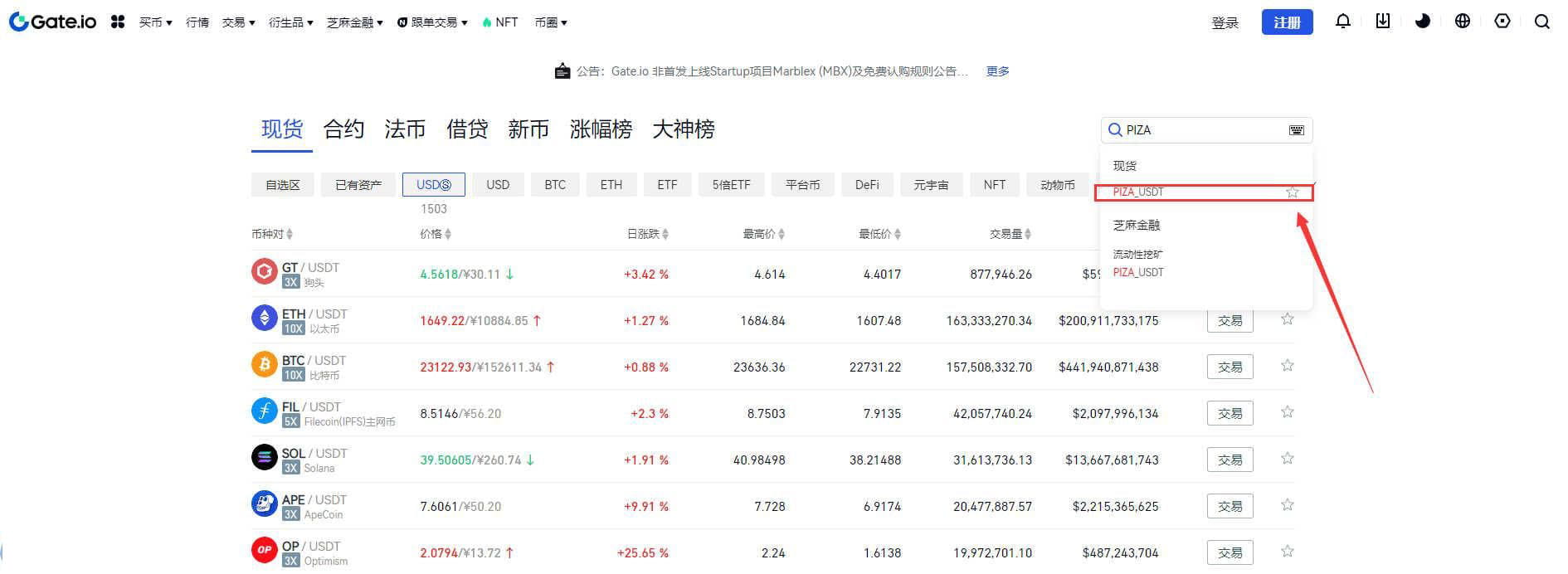 第三步:找到PIZA/USDT交易对,点击进入购买页面。