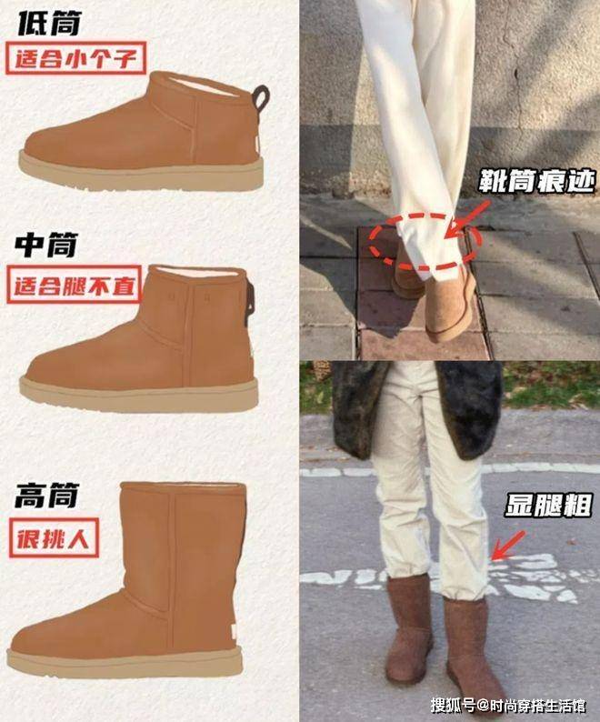其次挑选雪地靴的时候还要注意筒高,雪地靴最常见的三种筒高就是短筒、中筒和长筒的款式,我们根据腿型选择合适的高度。正常来说大家选择最多的筒高就是短筒和中筒的款式,主要这两种筒高不超过小腿中部的位置,对于腿粗或者腿胖的女性来说非常的友好,完全不用担心会暴露腿部缺点。