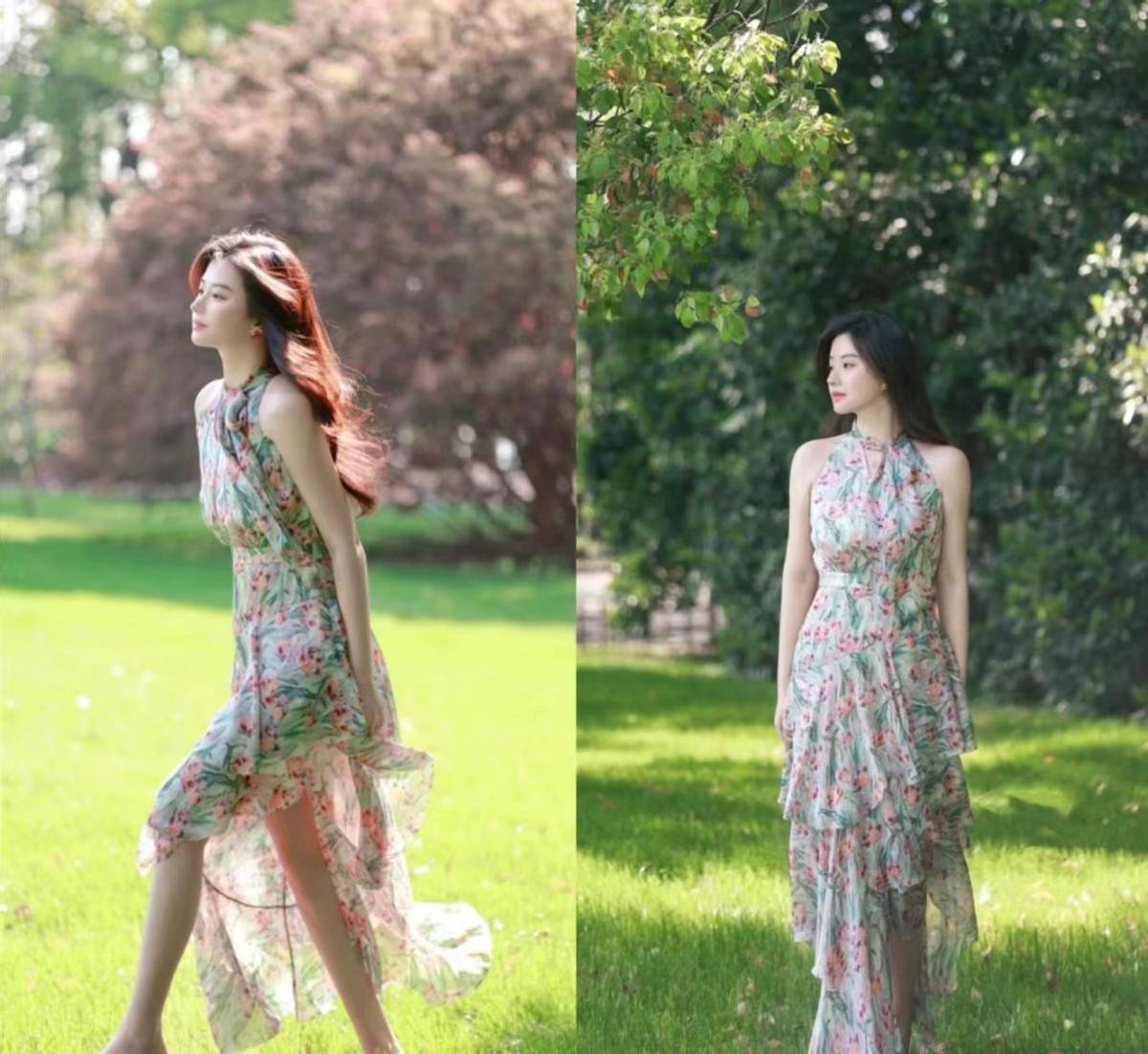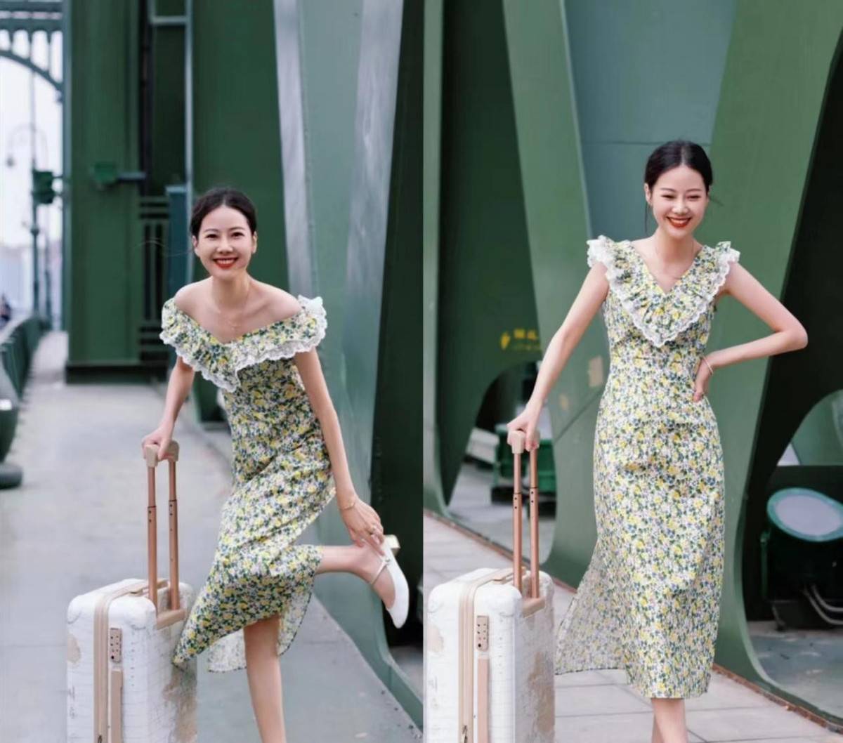 比如这款碎花样式的过膝连衣裙,它是比较显瘦的一套服饰,而且领口的样式比较宽大,既可以塑造出一字肩的视觉效果,又可以打造出v领的裁剪。