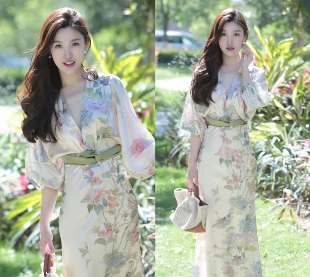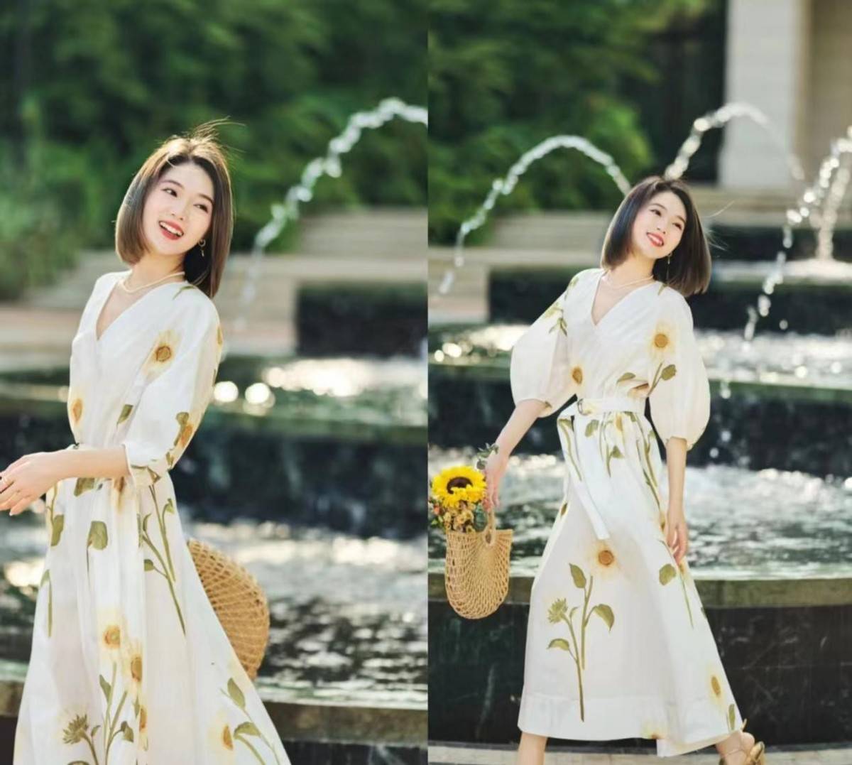 如果想要让裙子具有一定的防晒效果,大家可以采取七分袖样式的连衣裙,以灯笼袖的设计为主,袖管更宽,穿起来更放松。