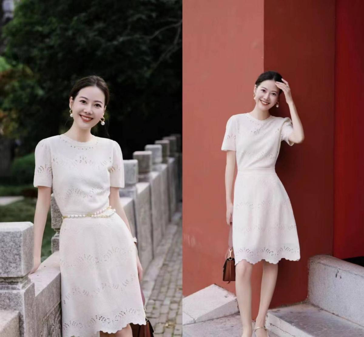 比如这款白色的连衣裙,它就是有着清新感和典雅感的存在,腰间珍珠腰链的加入,也能让造型有贵气感,并且可以同时修饰身材比例。