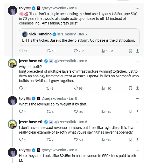 事情的起因是Solana联合创始人Toly公开质疑Base并未真正推动以太坊生态的增长,反而有“吸血”之嫌。Base创始人Jesse则针锋相对地回应,Base与以太坊并非零和博弈,而是共同发展。Toly进一步以谷歌和微软与Linux的关系作比,暗示Base的价值主要被Coinbase(而非以太坊)所“捕获”。