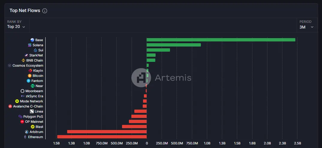 此外,Base在资金流入方面也表现出强劲的势头。近三个月,Base净流入资金高达25亿美元,超过Solana的9亿美元,成为资金净流入最多的公链。