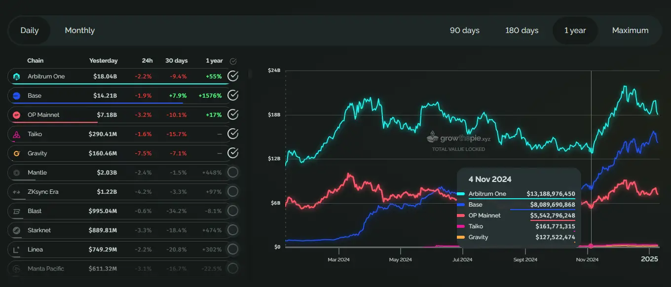 Base的快速增长与多种因素有关,包括整体市场的复苏以及近期Virtuals Protocol的崛起。Virtuals Protocol作为一个AI Agent一键发布平台,精准地抓住了AI Agent的风口,催生了多个市值过亿的AI Agent代币,有效地缩小了Base与Solana在MEME领域的差距。
