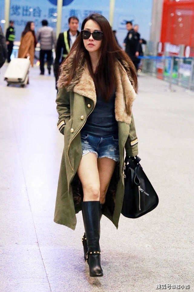 伊能静在机场中还尝试过一组派克服大衣的搭配,这身军绿色的派克大衣造型特别酷飒,长度是中长款,刚好盖过臀部,能藏住胯宽,给下半身留出了露肤空间,搭配牛仔短裤露出她的小腿线条,中和了外套的臃肿感,反而特别显瘦增高。