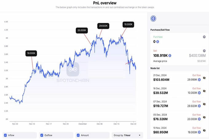 自从某事件以来,以太坊价格持续上涨,而孙宇晨已经在这段时间内向某平台转入多次ETH,总价值数亿美元,平均价格为数千美元。从价格走势图来看,几乎每次转移都发生在当时的高点。
