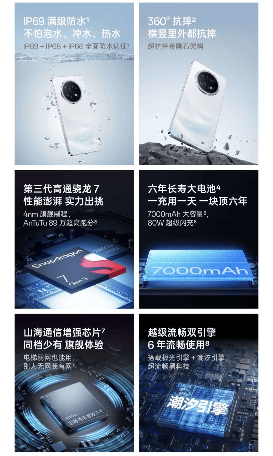 性能方面,OPPO A6I 搭载4纳米制程的高通骁龙 7 Gen3 处理器,安兔兔跑分达 89 万。搭载自研山海通信增强芯片,即使在弱网环境下也能迅速切换更优网络。手机配备 6.8 英寸屏幕,峰值亮度达 1600 尼特,并支持湿手油手触控。