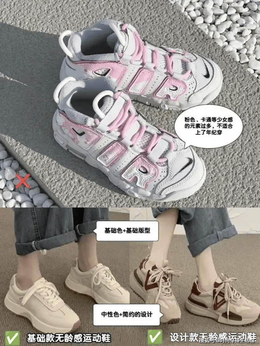 最后我们还可以看到很多运动鞋非常的个性和潮流,这一点在潮牌运动鞋上面完整的体现出来了,这样的运动鞋乍一看确实非常吸睛,但是在搭配的过程中超级感,同时还很容易破坏整体搭配的层次感,那么最好的方式就是选择纯色简约的款式,这样不会导致整体穿搭的重心往下移,从而出现突兀感影响我们的身材比例。所以说中年女性在选择运动鞋的时候要简单不要复杂。