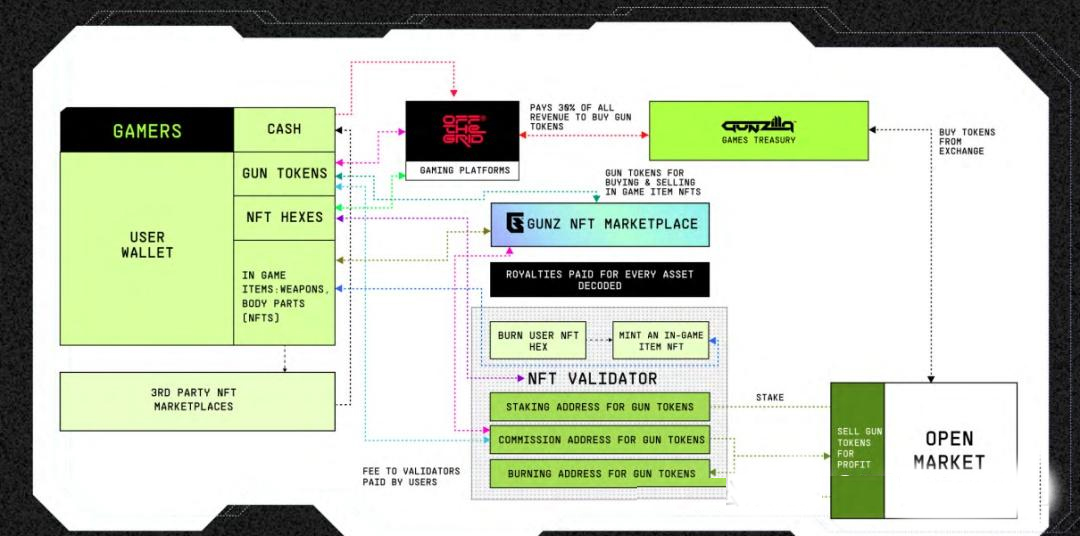 《Off The Grid》是一款大逃杀 2.0 FPS 类游戏,游戏内的资产都存储在链上,这意味着玩家可以拥有和掠夺游戏内的物品,甚至是其他玩家的物品。所以,Gunzilla Games 想要打造的是一个 Web3 的大逃杀 2.0 游戏,而 GUNZ 是链上服务平台,其核心功能包括:游戏内虚拟资产管理,链上交易市场,区块浏览器,代币和 NFT 铸造引擎,用于玩家的链上 NFT 交易。