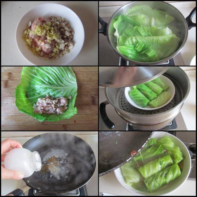 推荐菜谱【蒸三鲜包菜卷】 原料: 肉馅 1小碗 包菜叶 1盘 姜末 少许 料酒1勺 生抽 1勺 水淀粉1勺 胡椒粉 少许 葱花 少许 盐 适量