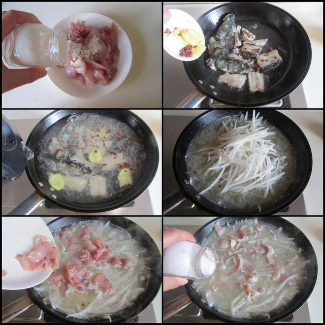 制作过程: 将黑鱼处理后清洗干净,将无刺的黑鱼腹部切成片备用; 剩下的黑鱼块切成块备用。 黑鱼片加入少许盐、淀粉、姜末、料酒等调味料拌均匀腌制5分钟备用。 白萝卜去皮后切成细丝备用。 烧热锅放入适量的油, 将黑鱼块放进锅中去煎,一面煎至金黄后翻面将另一面也煎至金黄,加入少许姜片和胡椒粒放进锅中去煎一下, 加入适量的水炖煮八分钟至汤汁微微发白, 捞出鱼骨后加入准备好的白萝卜丝放进锅中继续去煮至汤色奶白, 下入准备好的黑鱼块进锅去煮,煮至鱼片发白后加入少许盐和胡椒粉调味,最后放入少许葱花即可。