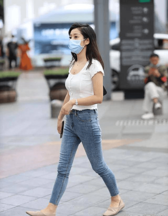 就如这位时尚小姐姐,穿了一款白色的短袖上衣,搭配一款蓝色的修身牛仔裤,脚穿一双浅咖色的平跟皮鞋,优雅中带着惬意的美,清爽靓丽又显身材。这样的穿搭释放出了牛仔裤在夏季的简约大方的美。白色的短袖衫,清爽又显气质,特别是简洁的圆领凸显出了成熟女性特有的锁骨美,修身的裁剪穿出了身材的挺拔,短袖的边缘和衣摆边缘呈现出了波浪形的花纹,好看又洋气,穿搭舒适又显轻熟的美。