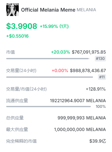 melania币的总发行量是10亿枚。这款币是由特朗普的妻子梅拉尼亚推出的,刚一亮相就引起了不少人的关注。从分配方案来看,团队拿到了35%的份额,财库占了20%,社区也分到了20%,公开发行占15%,流动性占10%。这个分配方案看起来是想在项目方、投资者、社区和市场流动性之间找到一个平衡点,为melania币的未来发展打下基础。不过,有一点需要注意的是,melania币的团队份额解锁速度和特朗普之前推出的TRUMP币相比,有着明显的不同。melania币的团队份额只需要锁仓30天,而TRUMP币却要锁仓3年。这意味着melania币的团队份额会更快地进入市场流通,但这也让市场上有些人担心项目方是不是有点儿急功近利了。