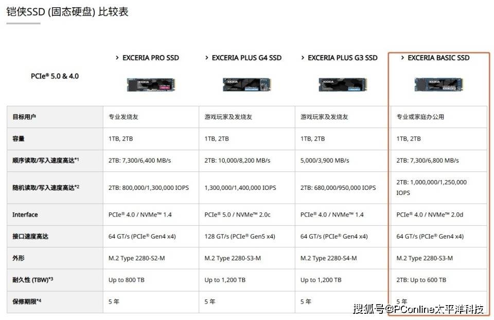 在评测开始之前,我们先来详细解读一下铠侠EXCERIA BASIC NVMe SSD的官方参数,并将其与同为铠侠自家SSD产品进行对比。