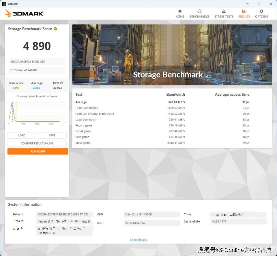 这不仅仅是跑分,更是模拟真实游戏加载场景。得分:铠侠EXCERIA BASIC NVMe SSD 1TB 得分约为 4890分,带宽:平均带宽在843.89 MB/s,加载《战地5》游戏速度达到了1470.62 MB/s,移动游戏速度更是达到了3340.31 MB/s。