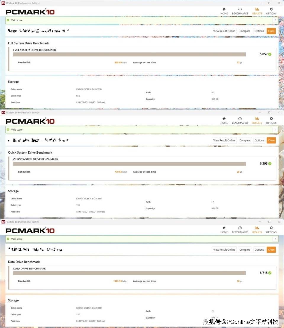 铠侠EXCERIA BASIC SSD 1TB固态硬盘PCMARK10全盘系统存储测试得分为5057,带宽速度为805.09 MB/s;快速系统存储测试得分为6393,带宽速度为779.68 MB/s;数据存储测试得分为8715,带宽速度为1303.99 MB/s。