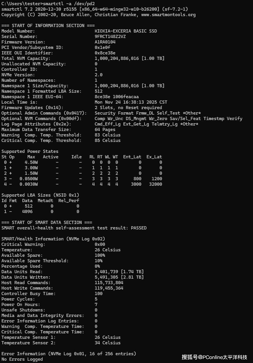 测试之前先使用smartmontools查看一下硬盘相关信息,产品型号为铠侠EXCERIA BASIC NVMe SSD,固件为A1RA0104,最大功耗为4.5W。