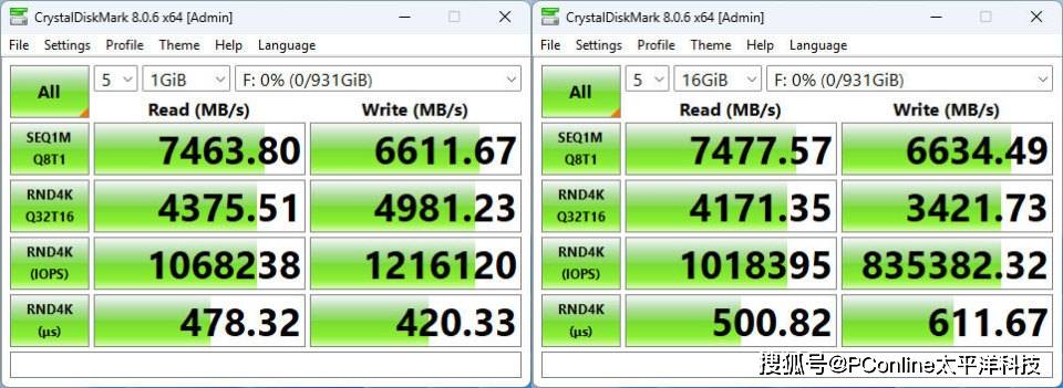 而4K随机读写的IOPS值也是 (RND4K Q32T16)一个非常关键的数据:RND4K 读取达到了1068K IOPS,写入更是达到了1216K IOPS,均达到官方标称值。