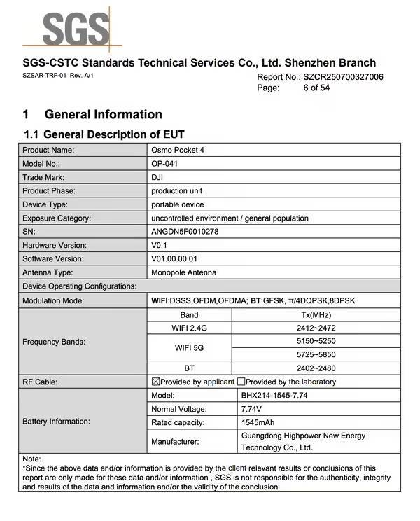 根据此前曝光的美国 FCC 认证文件,Pocket 4 将内置一块 1545mAh 的电池,相比前代 Pocket 3 的 1300mAh 电池,物理容量提升约 18.8%。文件同时确认新机将继续支持低功耗蓝牙技术。